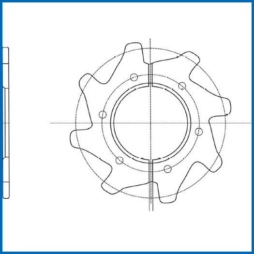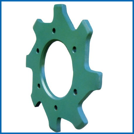 鏈輪適用于模鍛刮板鏈,鏈輪為雙片,中間配有輪轂,輪片裝配在輪轂上,裝配方便,輪片整體調(diào)質(zhì),齒部高頻淬硬,使齒部的硬度較高,更具耐磨性。